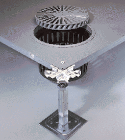 Diffuser - a round lexan insert for allowing air flow distribution from under a raised access floor. Provided with a flanged top surface to allow for dropping into a round hole cut into a panel. Used when the subfloor is a supply plenum and the surface of the access floor is either vinyl composition tile or carpet. Can be substituted for a grill to provide similar air flow properties. Requires a finished floor height of 8" or more.